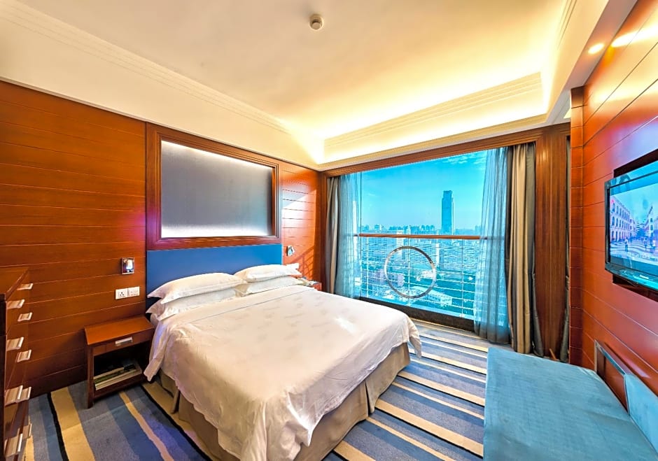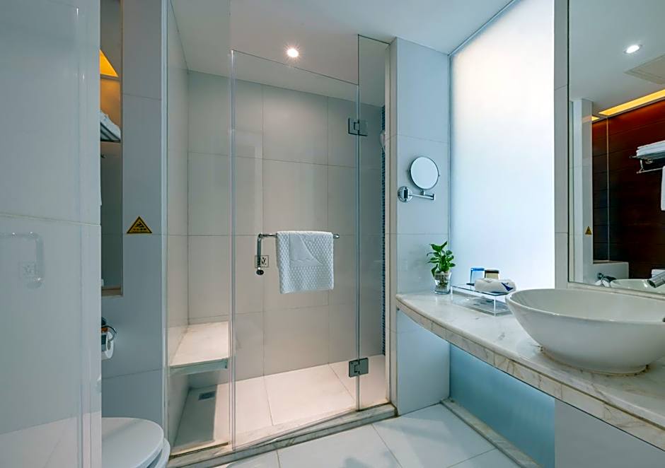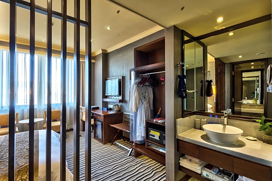Overlooking the beautiful city, spacious 150-square-yard suite offers ocean-theme decor along with a separate living area with a comfortable sofa set, a 42-inch flat-screen TV and a computer. It is located on the floors 8-21. The large private bathroom includes a hairdryer, bathrobes and rainshowers. Free Wi-Fi and free domestic calls are provided.